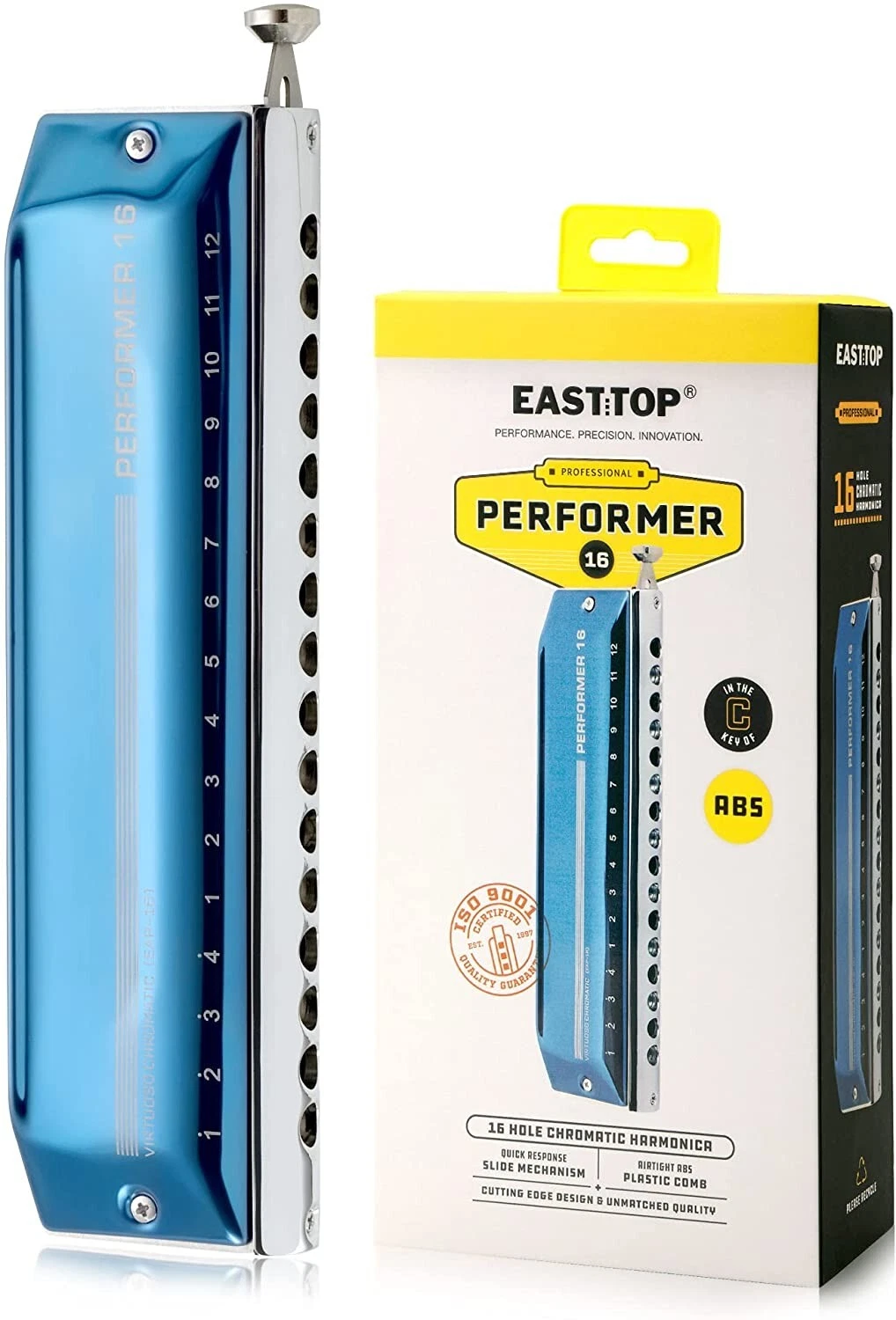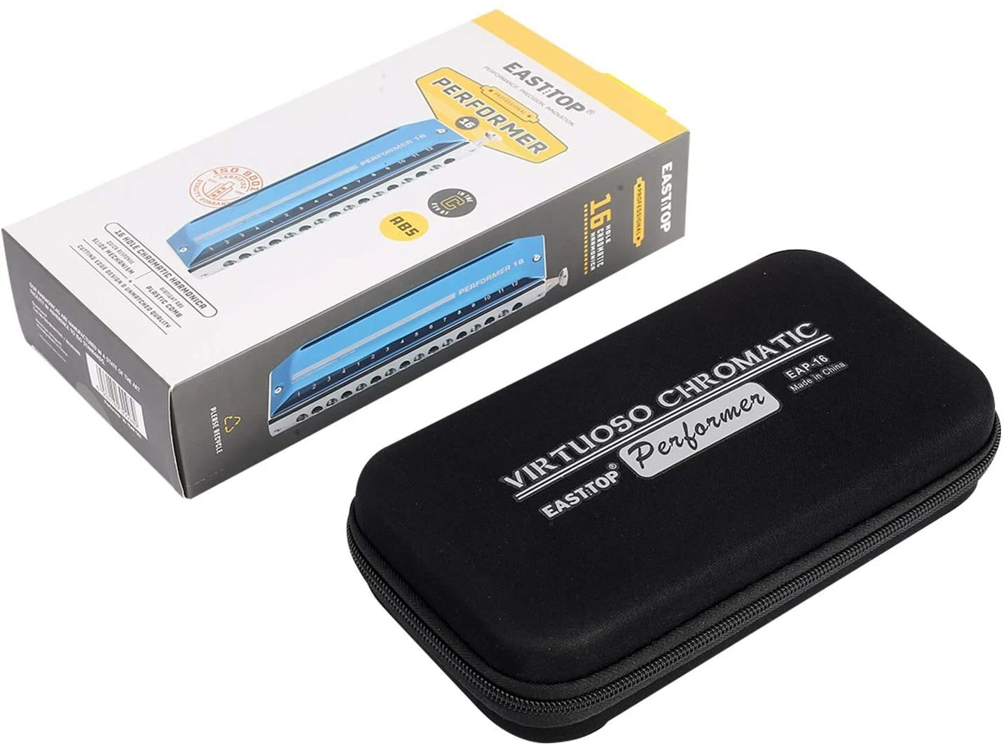 هارمونیکا کروماتیک Easttop EAP-16 یک ساز دهنی حرفهای است با ۱۶ سوراخ و ۶۴ تُن در کوک C که برای نوازندگان جدی، هنرجویان پیشرفته و تمام کسانی که دنبال یک ساز کامل و قدرتمند برای اجرای ملودیهای پیچیده هستند طراحی شده است. این مدل، نسخهی Performer / Advanced برند Easttop است و بهخاطر کاور آبی جذاب و کیفیت صدای بالا، در بین هارمونیکا دوستان محبوب شده است.